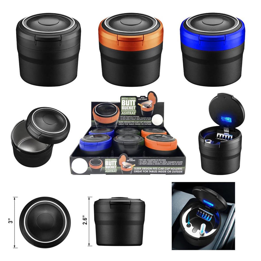 This self?extinguishing metal ashtray safely snuffs out embers and reduces smoke, with a built?in LED light for easy use in low light. Compact and durable for home, patio, office, or car, it helps keep ash and odor contained and wipes clean easily. Keywords: self?extinguishing ashtray, metal ashtray, LED light ashtray, smoking accessories, portable ashtray.